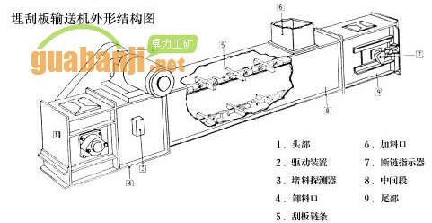 埋刮板輸送機(jī)是一種在封閉的矩形斷面的殼體內(nèi)借助于運(yùn)動著的刮板鏈條連續(xù)輸送散壯物料的運(yùn)輸設(shè)備,因?yàn)樵谳斔瓦^程中,刮板鏈條埋于被輸送的物料之中,故而稱“埋刮板輸送機(jī)”。