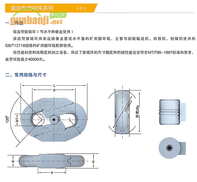 弧齒型接鏈環(huán)用來鏈接垂直面或水平面的礦用圓環(huán)鏈,主要與刮板輸送機、轉載機、跑煤機使用的GB/T12718規(guī)格的礦用圓環(huán)鏈配套使用。
